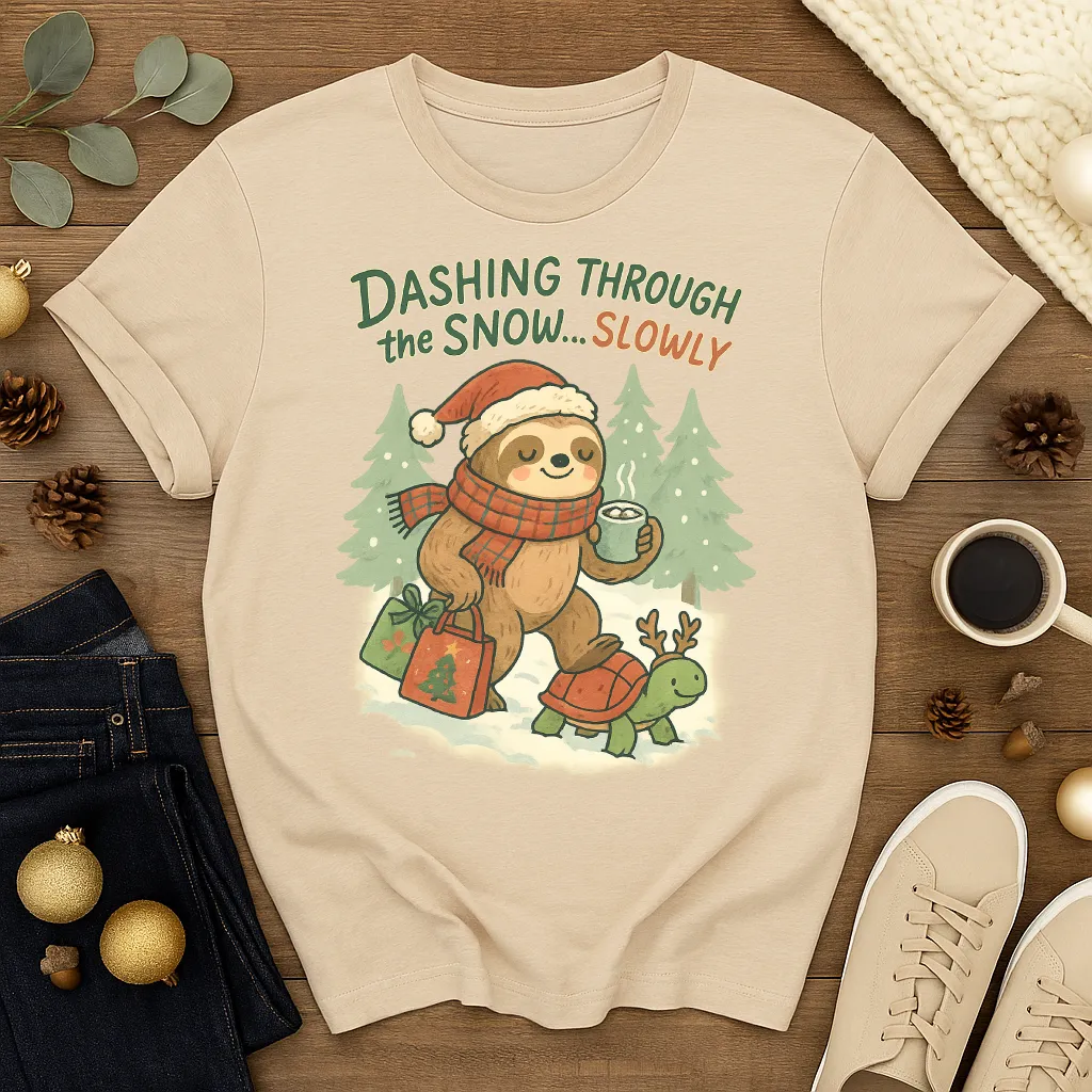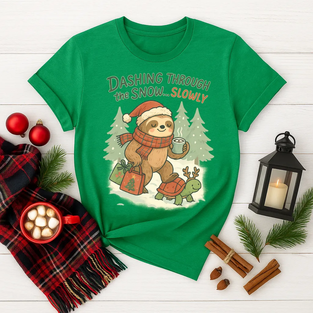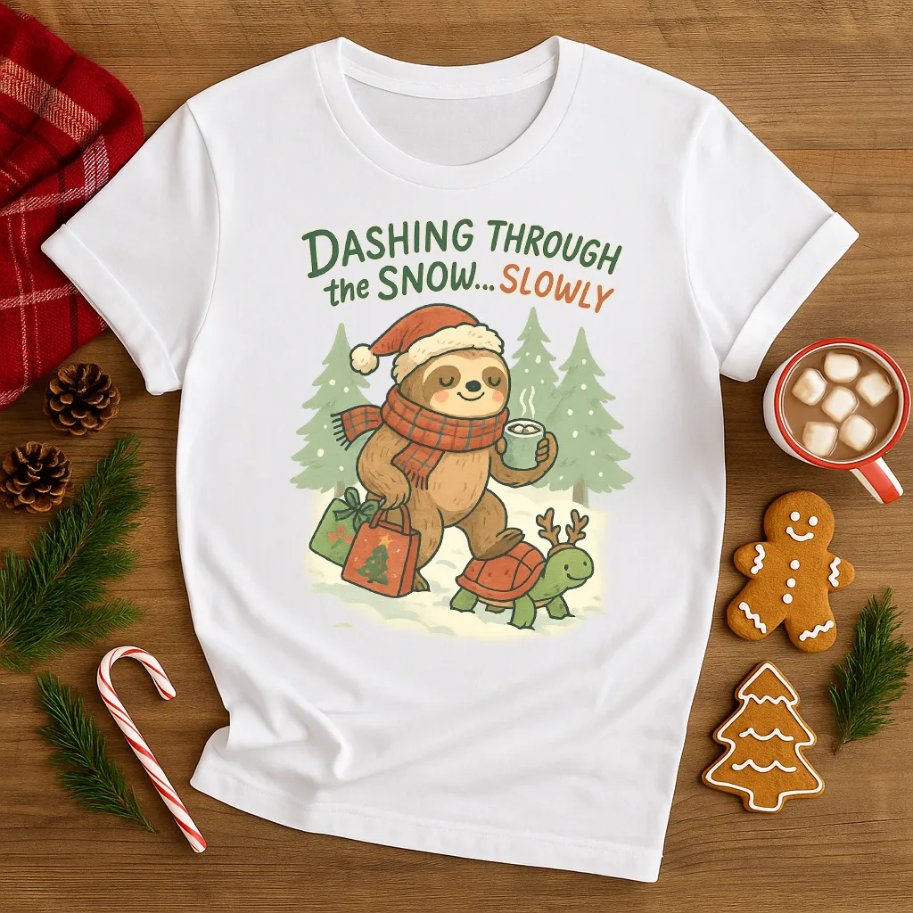 Take it easy this holiday season with this hilarious Christmas sloth shirt! 🦥🎄 Featuring a cozy sloth in a Santa hat, sipping cocoa while riding a reindeer-turtle, this playful tee says it all: “Dashing Through the Snow… Slowly.”