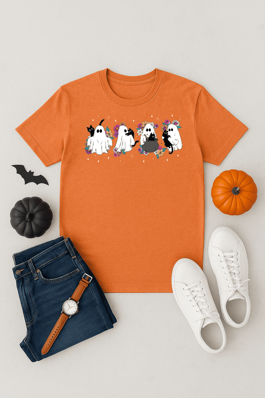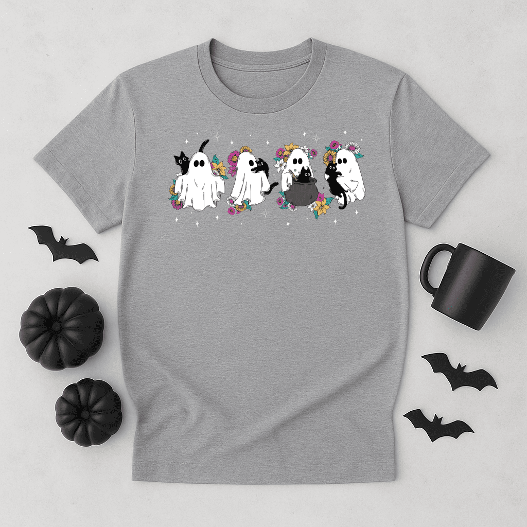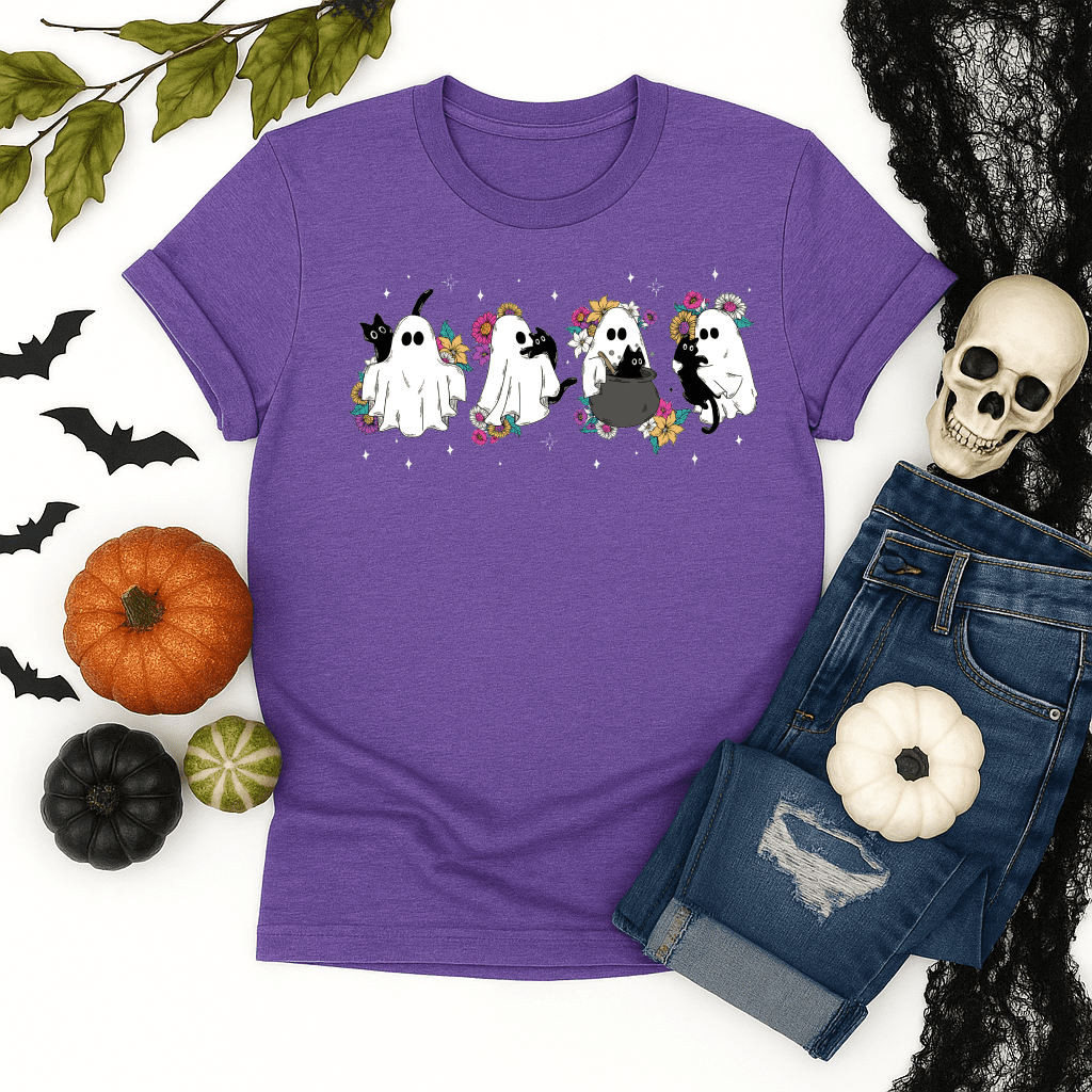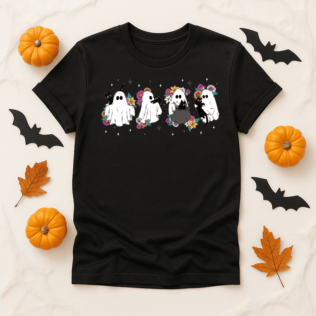 Ghosts and Cats Halloween Shirt – Cute Ghost Graphic Tee with FlowersGhosts and Cats Halloween Shirt – Cute Ghost Graphic Tee with Flowers