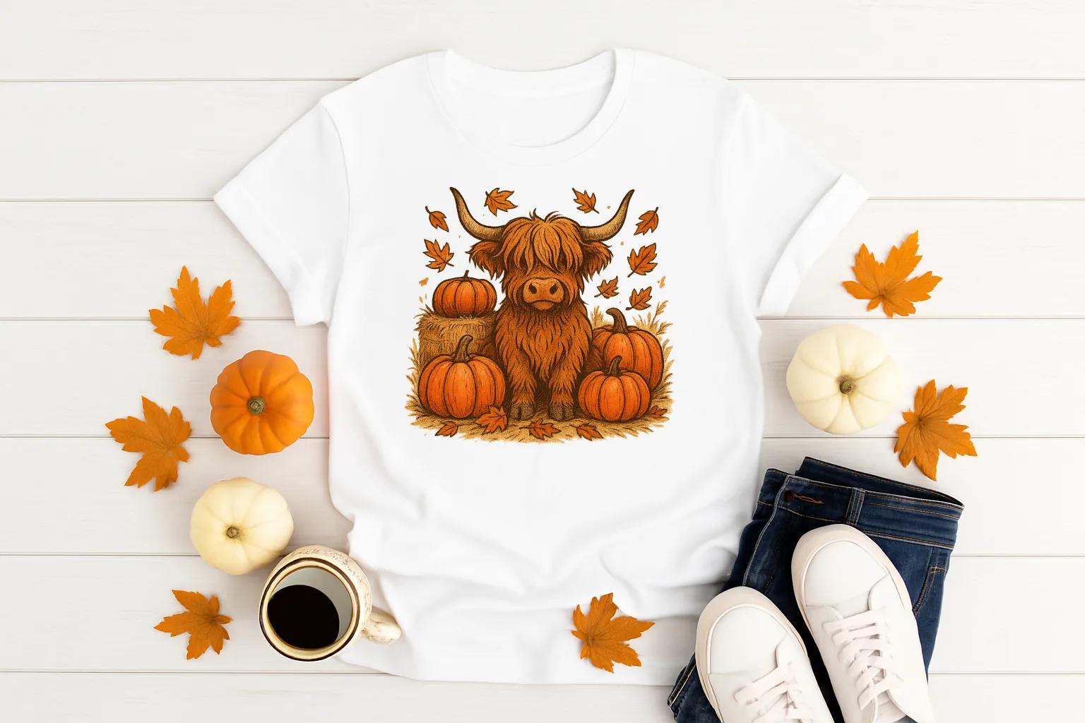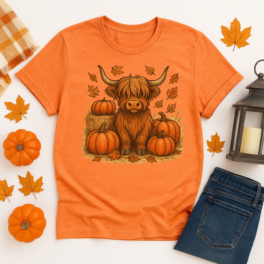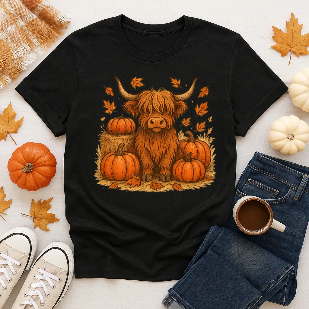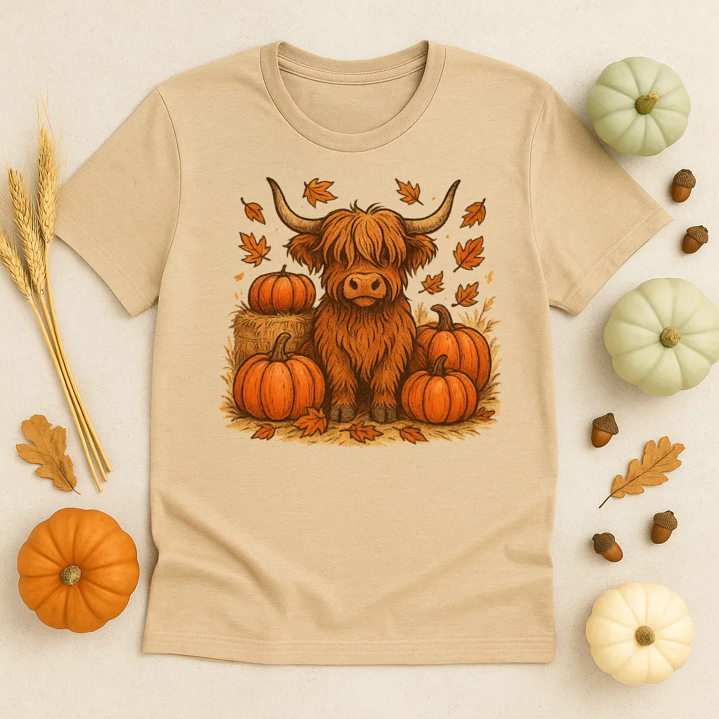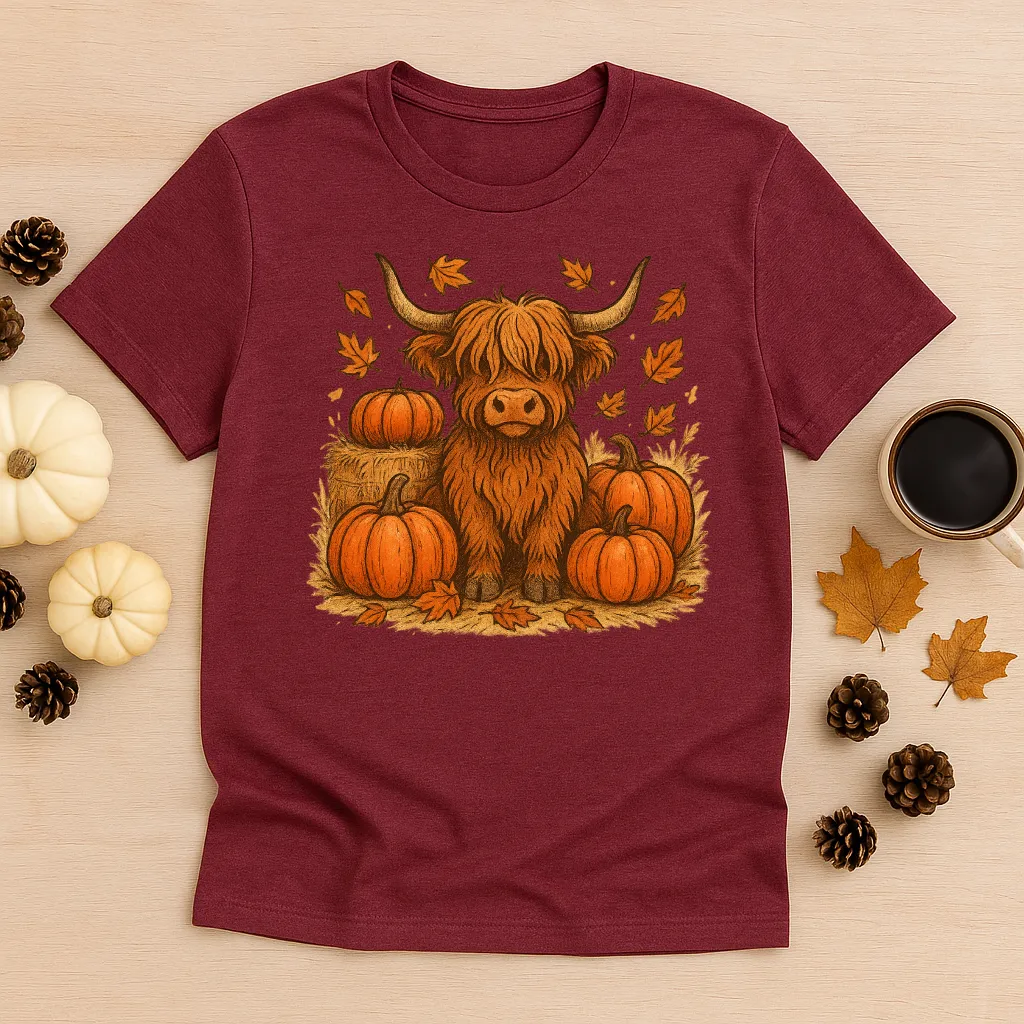 Bring cozy fall vibes to your wardrobe with this adorable Highland cow autumn t-shirt! Featuring a fluffy Highland cow surrounded by pumpkins, hay bales, and falling autumn leaves, this country-inspired tee is perfect for pumpkin patch visits, hayrides, and cozy fall days. A must-have for farmhouse lovers and anyone who adores rustic autumn style.