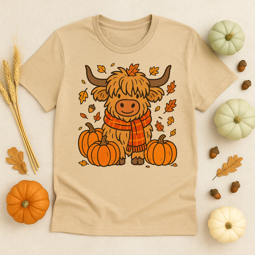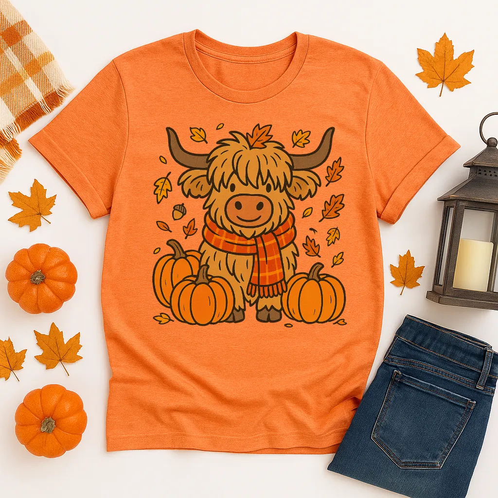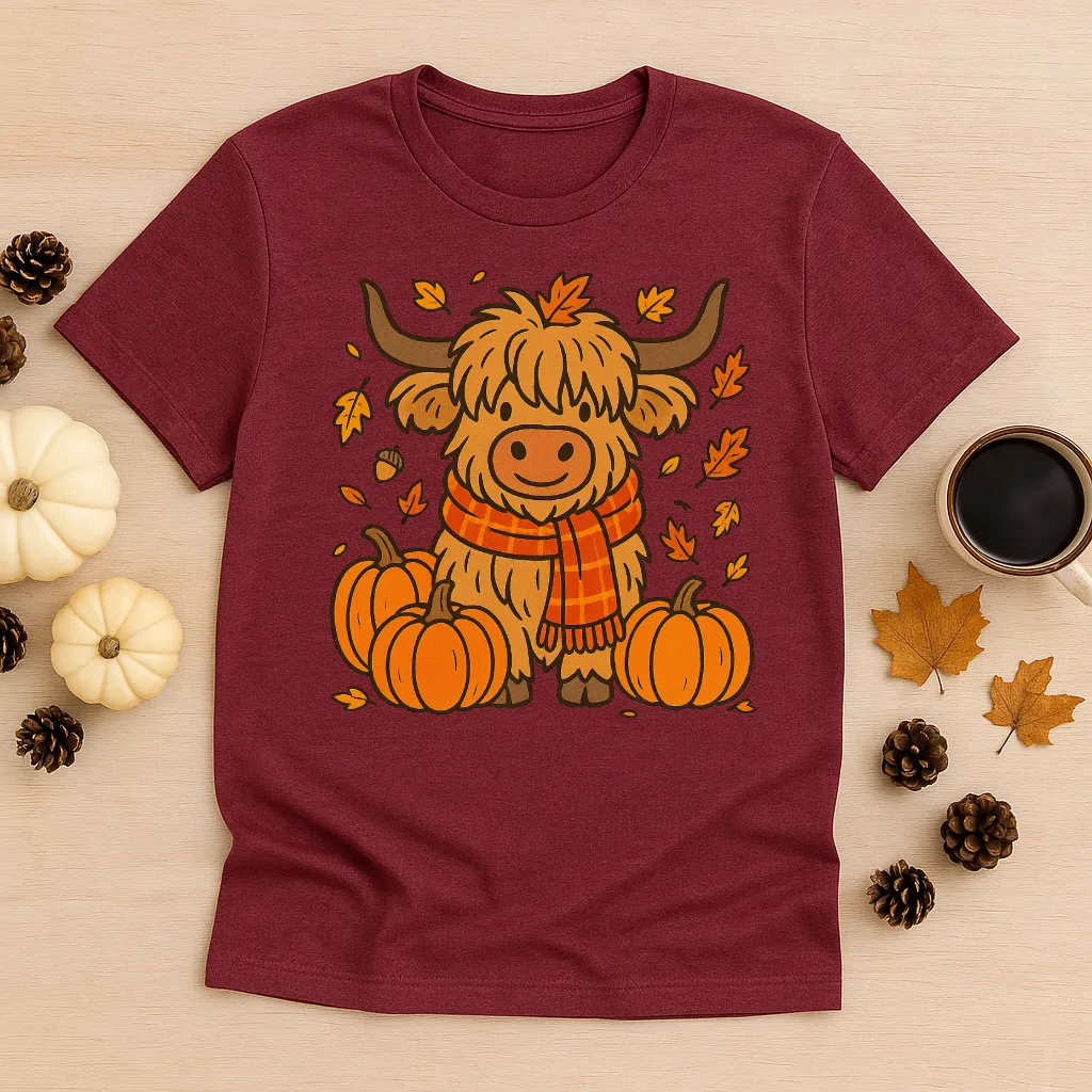 Cozy up for fall with this adorable Highland cow shirt! Featuring a fluffy Highland cow wearing a plaid scarf, surrounded by pumpkins and autumn leaves, this tee captures the charm of crisp autumn days and cozy farm vibes. Perfect for pumpkin patch trips, Thanksgiving gatherings, or anyone who loves rustic fall fashion.