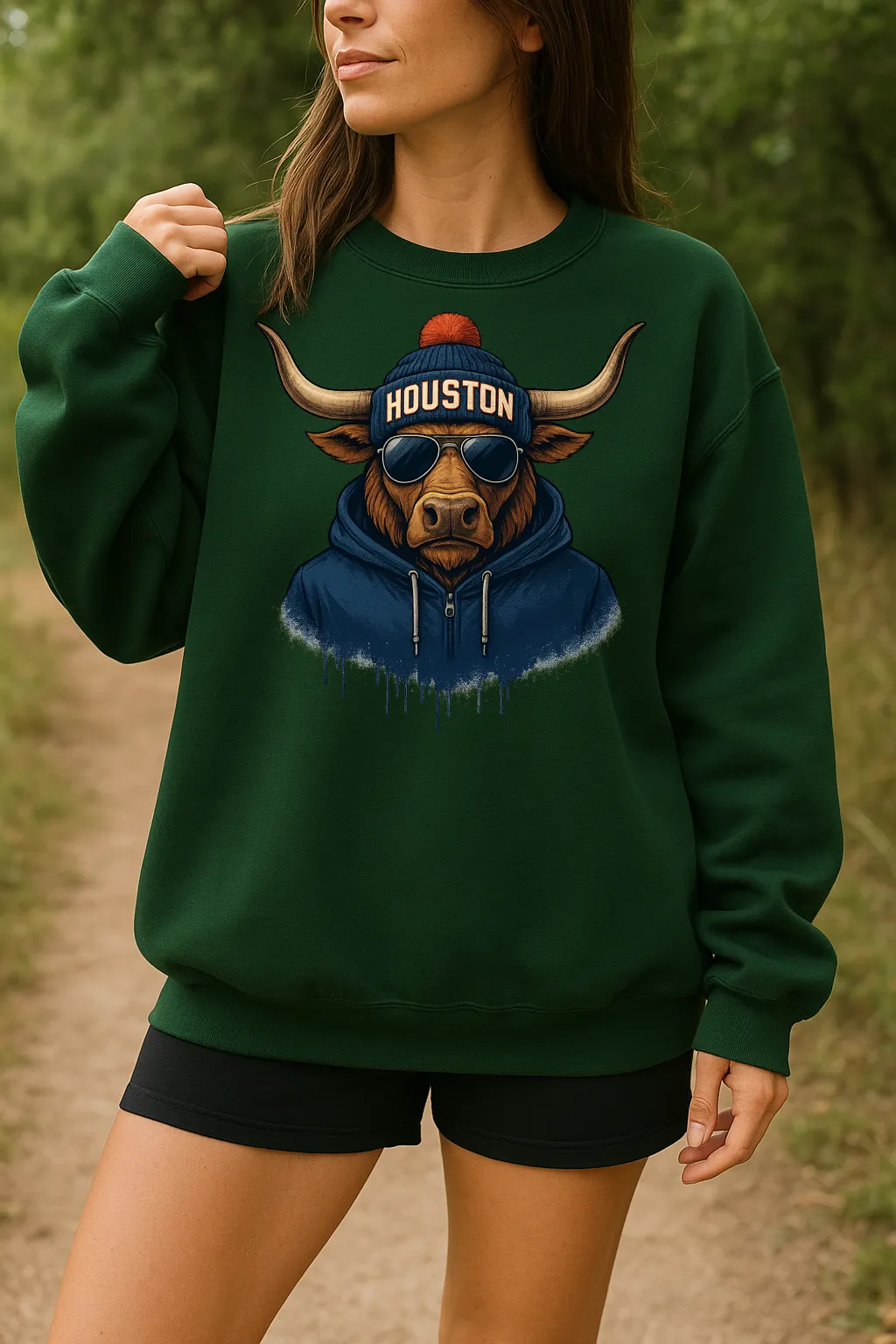 Show off bold Texas style with this unique Houston sweatshirt 🐂✨ Featuring a detailed longhorn in reflective aviator sunglasses, a navy hoodie, and a knit beanie with Houston across the front topped with a red pom, this design combines modern streetwear attitude with southern charm. Perfect for layering on cool days, casual outings, or repping Houston with a standout look.