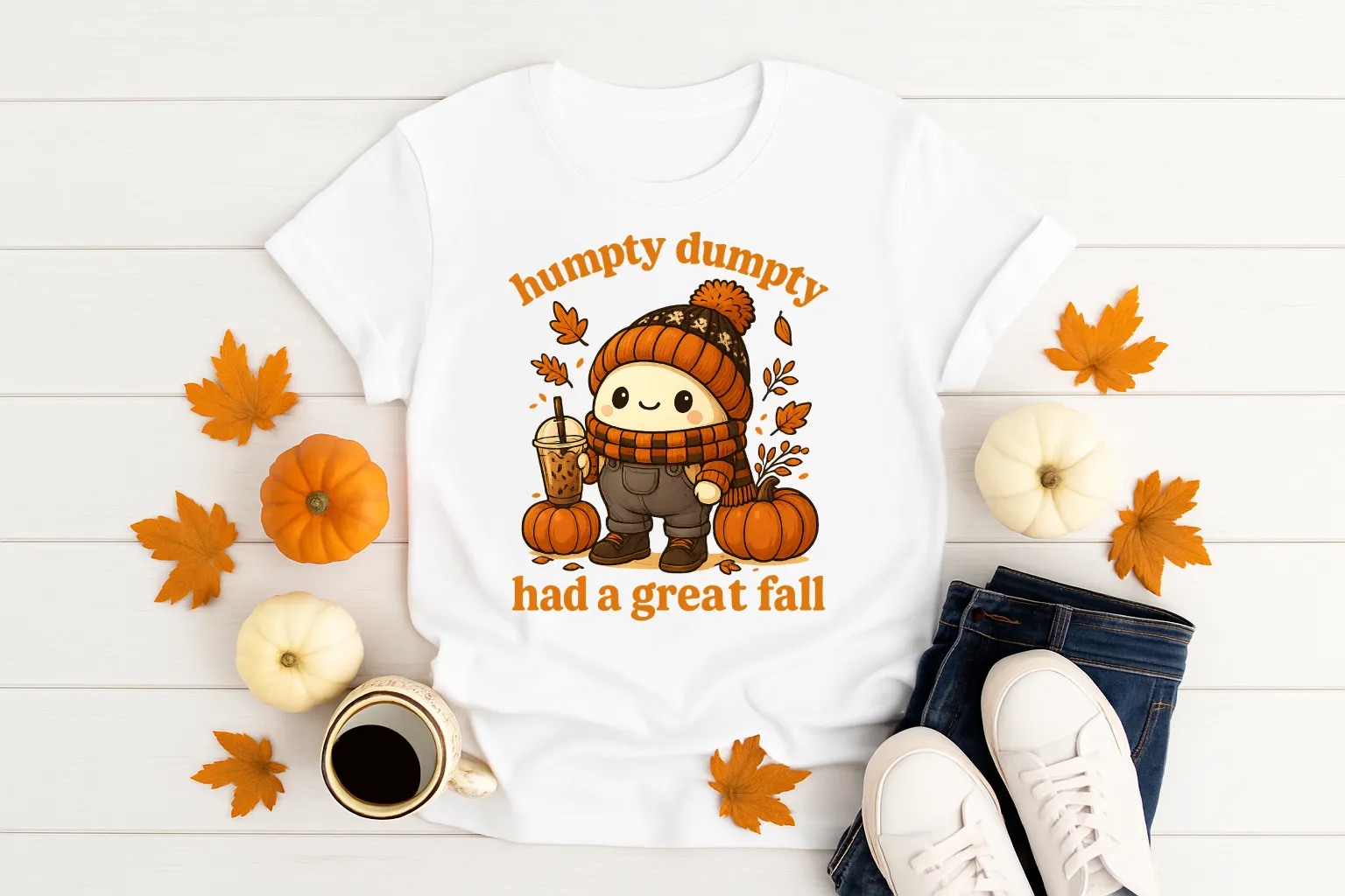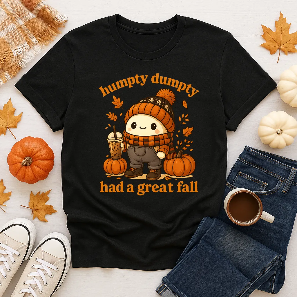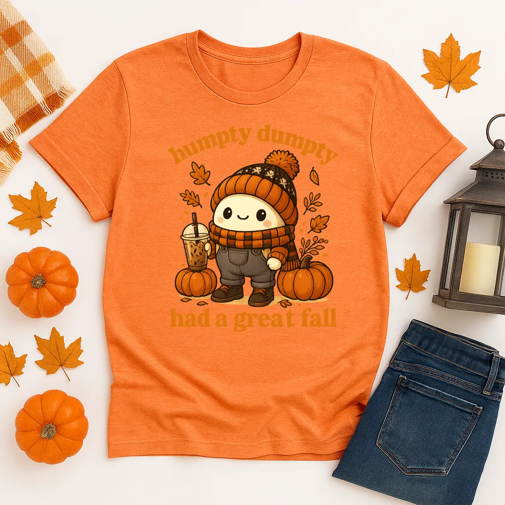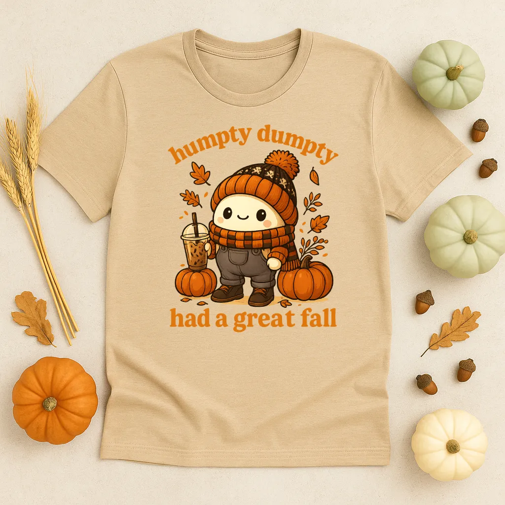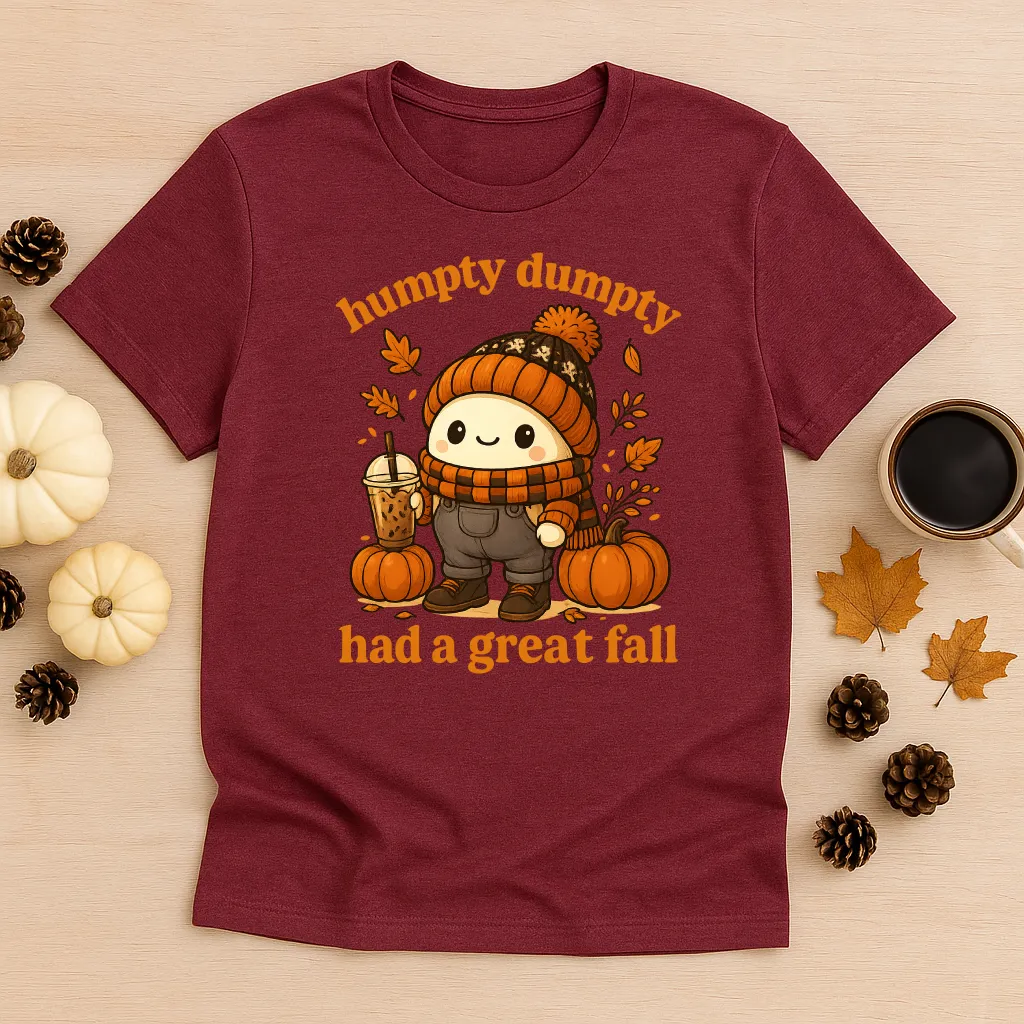 Add a playful twist to your fall wardrobe with our “Humpty Dumpty Had a Great Fall” shirt! Featuring a cozy, pumpkin spice–ready Humpty Dumpty dressed in autumn gear, this tee blends humor and cuteness for the perfect seasonal look. Whether you’re sipping iced coffee, pumpkin picking, or just enjoying sweater weather, this shirt is a conversation starter that spreads smiles.