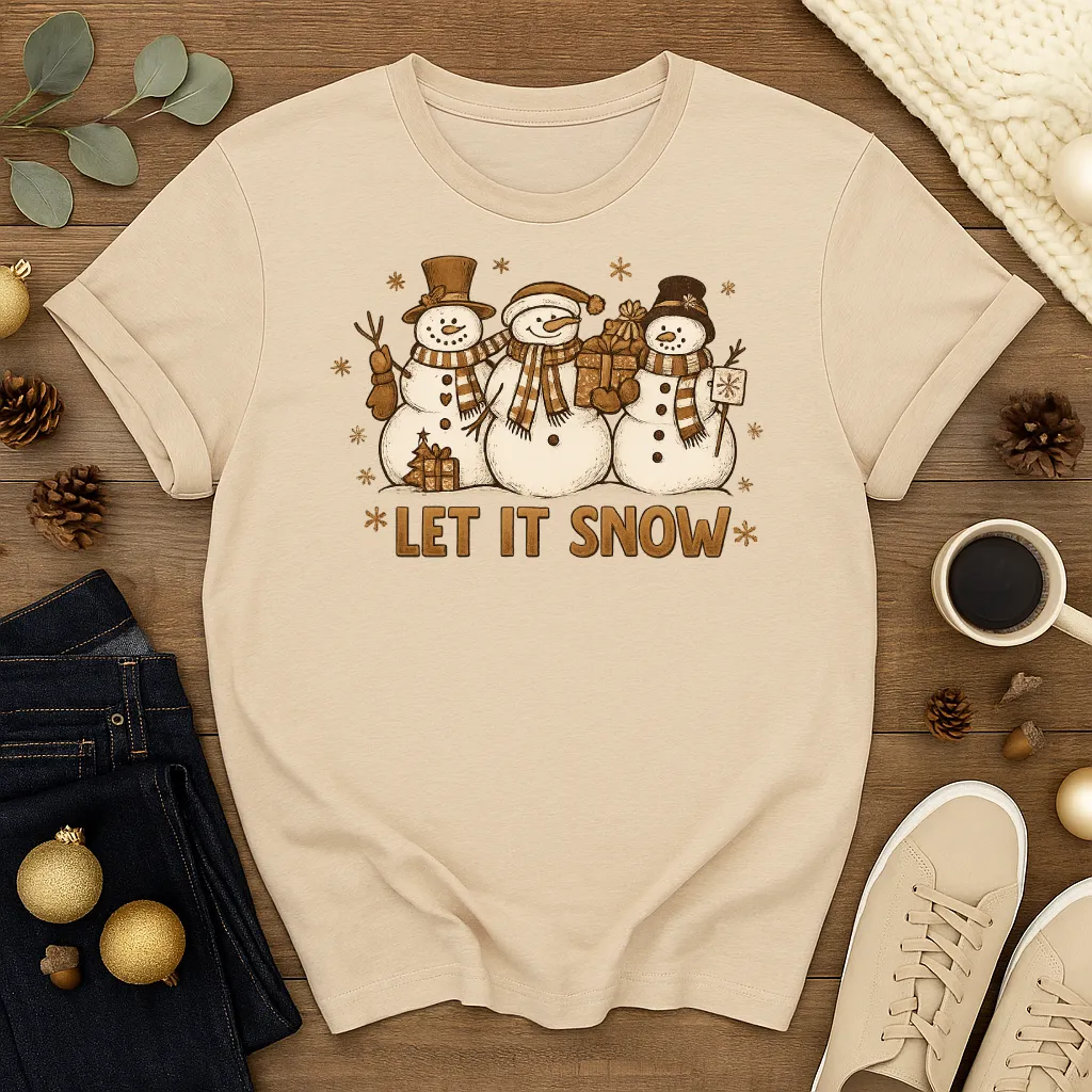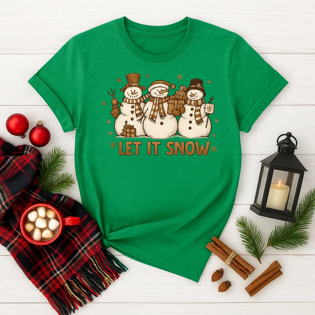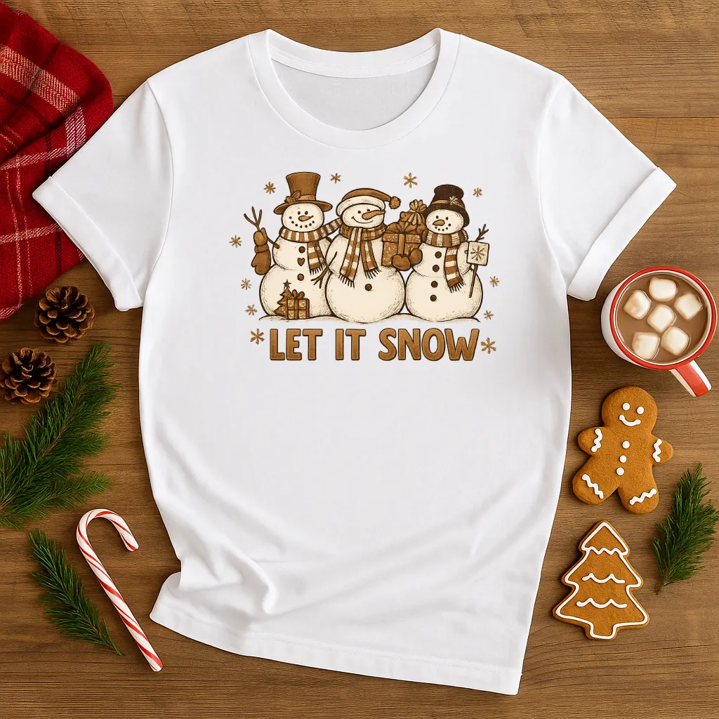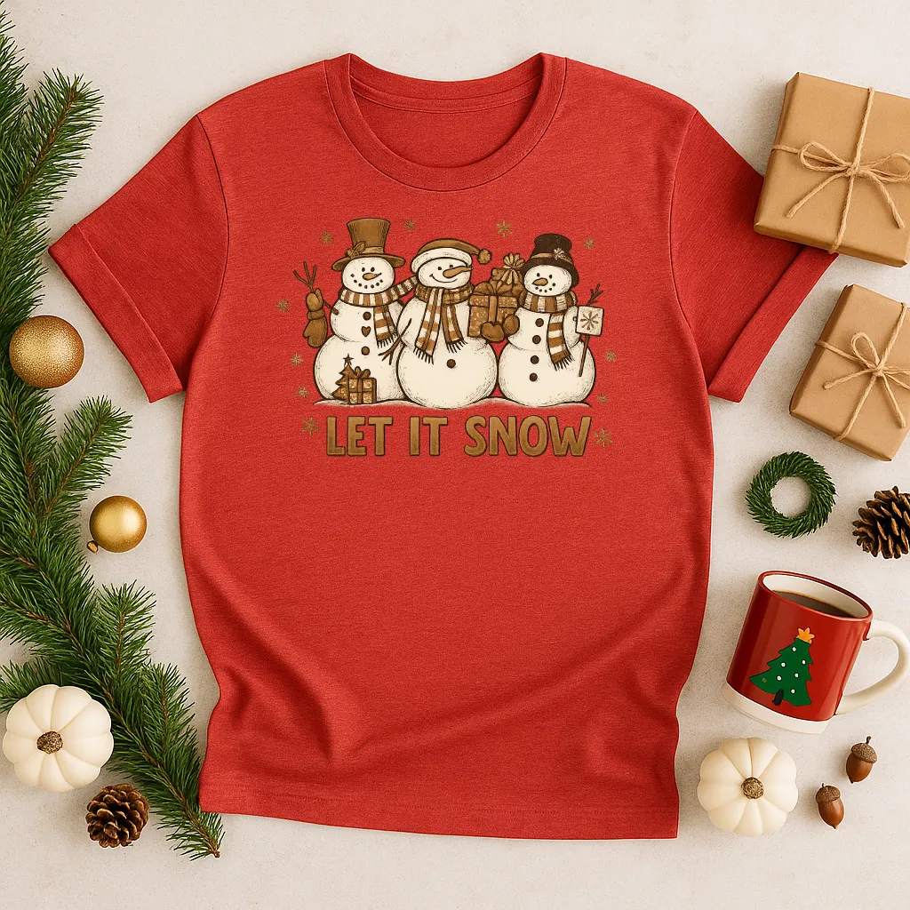 Celebrate the magic of the season with this charming Let It Snow snowman trio t-shirt. Featuring three rustic-style snowmen dressed in cozy scarves and top hats, holding gifts and holiday cheer, this design blends Christmas spirit with a farmhouse aesthetic. Perfect for sipping hot cocoa, decorating the tree, or enjoying snowy days, this shirt makes a cozy and festive addition to your winter wardrobe.