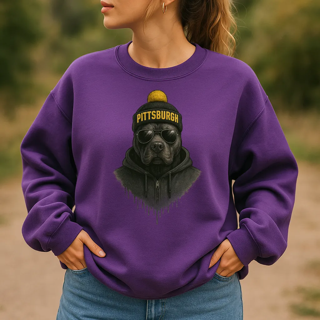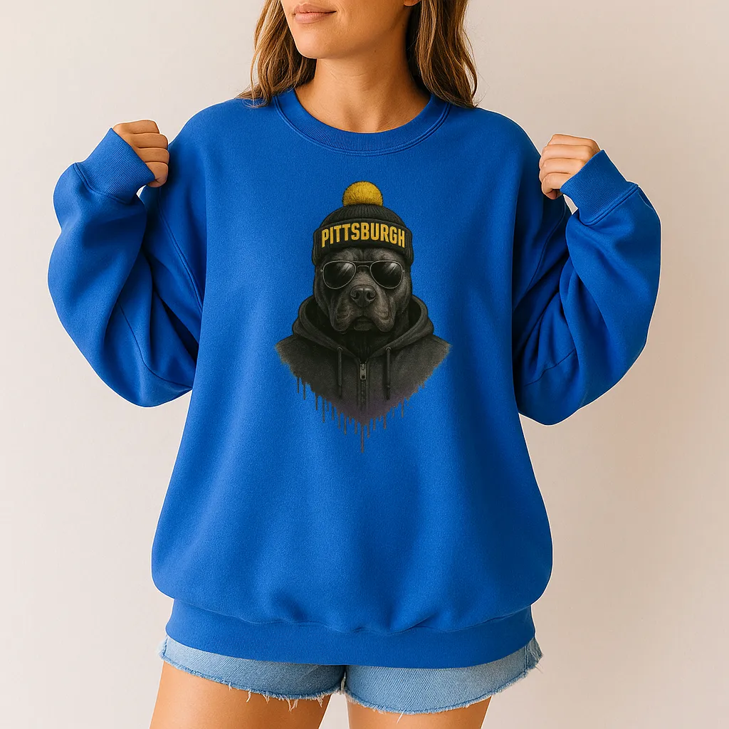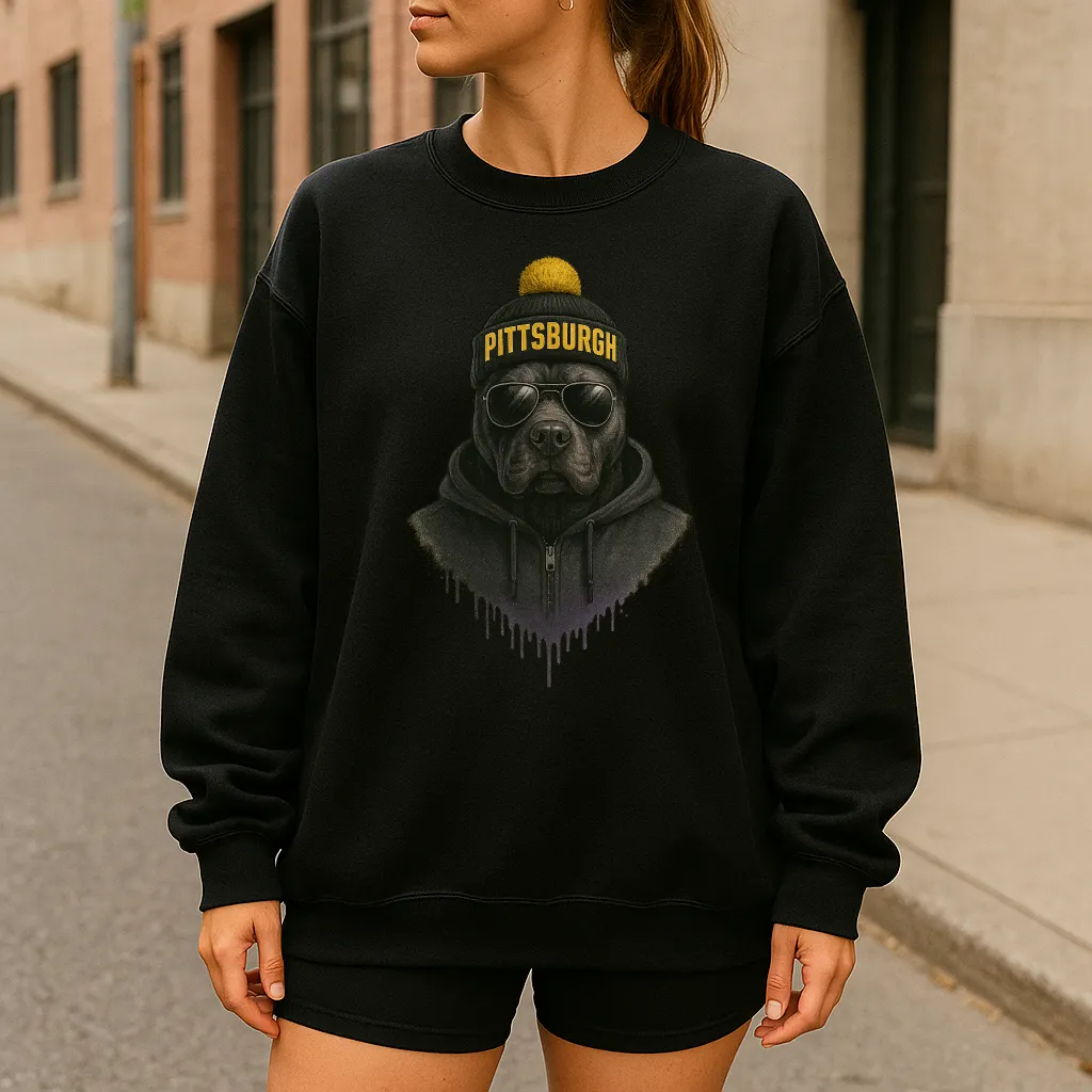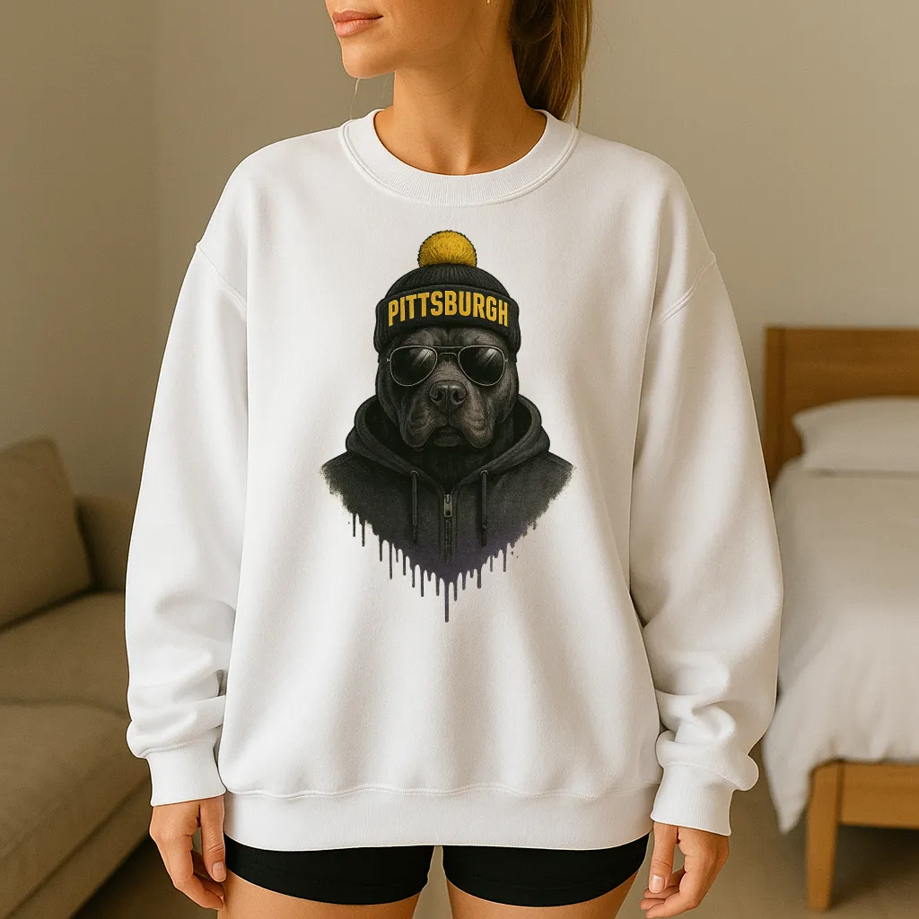 Bring a bold edge to your wardrobe with this unique Pittsburgh sweatshirt 🐾✨ Featuring a hand-drawn dog in reflective aviator sunglasses, a black hoodie, and a knit beanie with Pittsburgh across the front topped with a yellow pom, this design fuses modern streetwear attitude with cozy comfort. Perfect for casual outings, layering in cooler weather, or repping your city in standout style.
