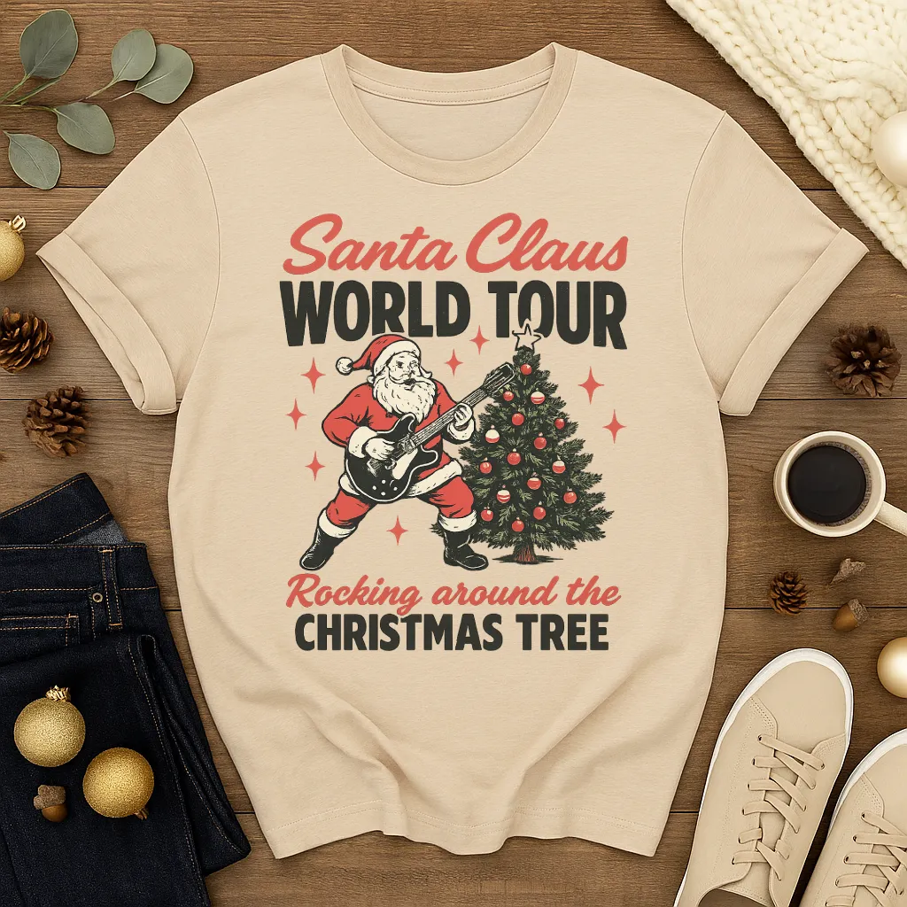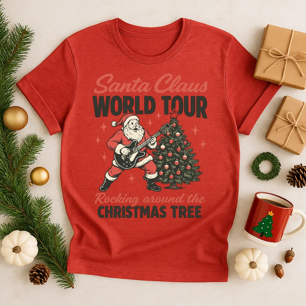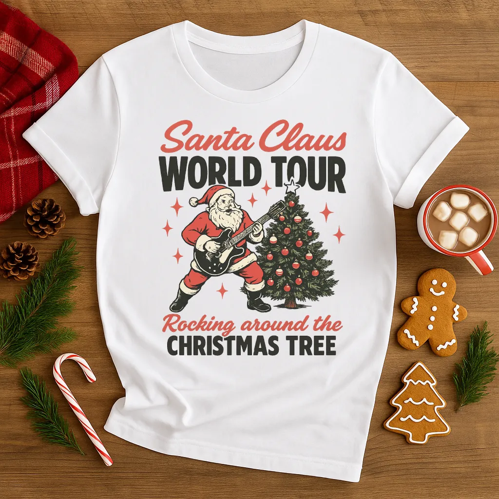Bring some rock & roll spirit to the holidays with our “Santa Claus World Tour” shirt! Featuring Santa jamming on an electric guitar next to a decorated Christmas tree, this retro-style tee is perfect for holiday parties, concerts, or just spreading festive cheer with a fun twist. A must-have for music lovers and Christmas enthusiasts alike!