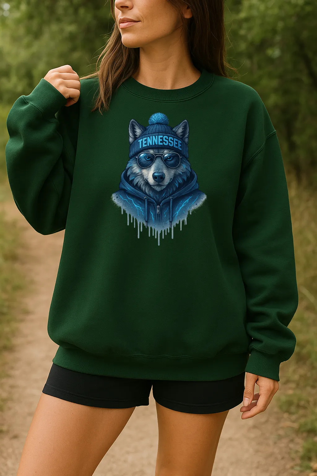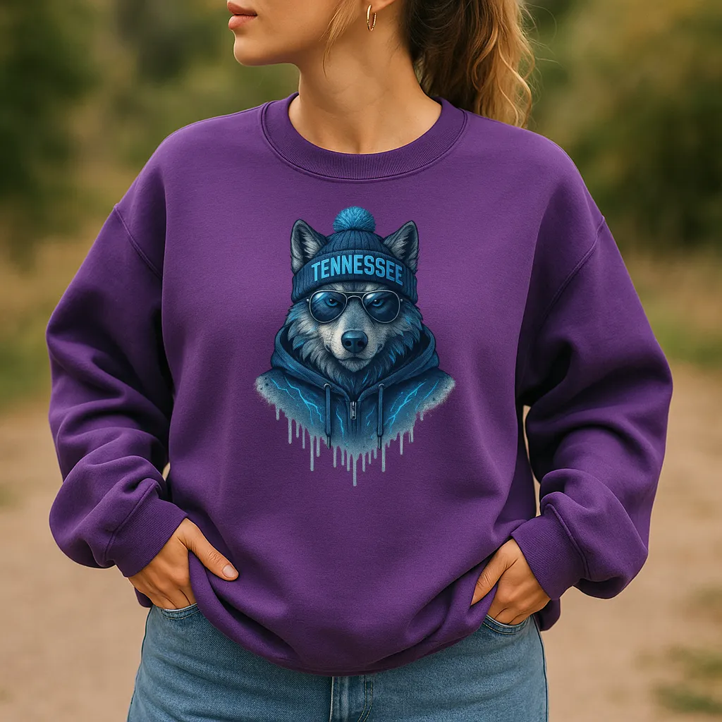 Add bold southern style to your wardrobe with this unique Tennessee sweatshirt 🐺✨ Featuring a detailed wolf in reflective aviator sunglasses, a dark hoodie, and a knit beanie with Tennessee across the front, this design fuses modern streetwear with cozy everyday comfort. Perfect for layering on cool nights, casual outings, or repping Tennessee with a standout look.