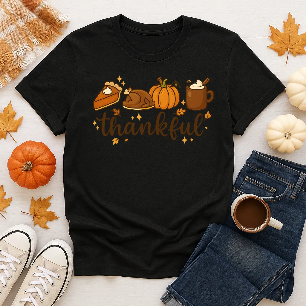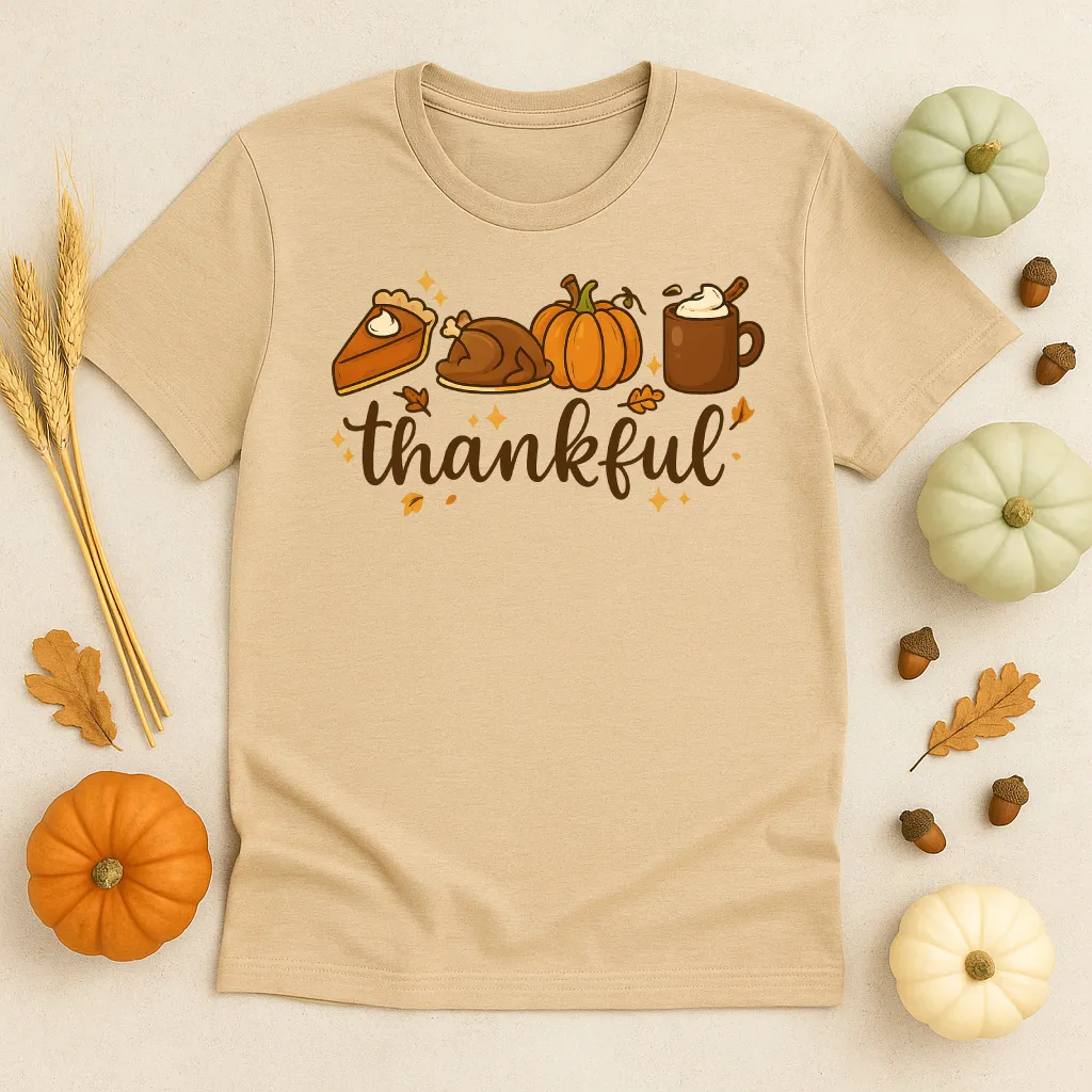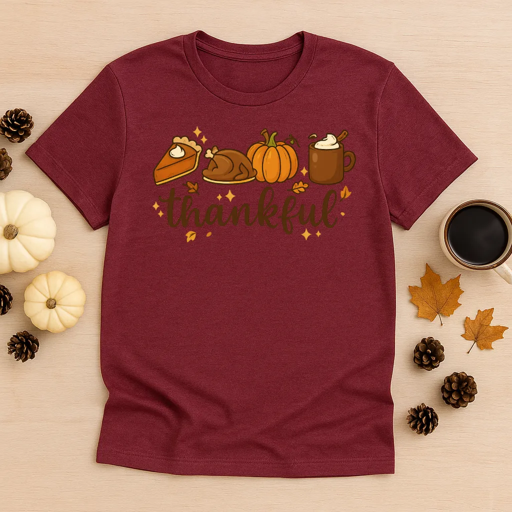 Show your gratitude in style with our “Thankful” tee — featuring pumpkin pie, a roasted turkey, pumpkins, and a warm fall drink. This cozy unisex shirt is perfect for Thanksgiving gatherings, Friendsgiving parties, or simply celebrating autumn with your favorite seasonal flavors. A festive and comfy way to wear your fall spirit!