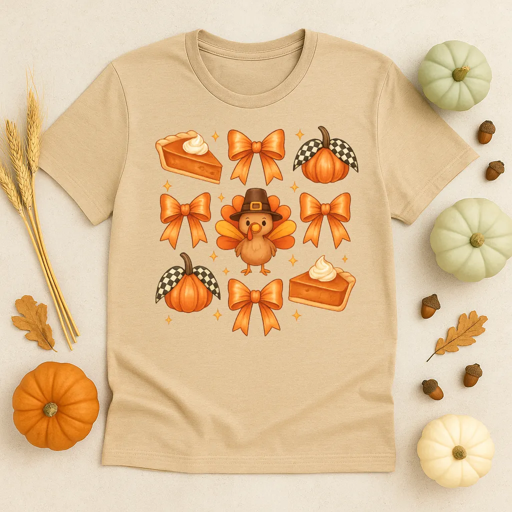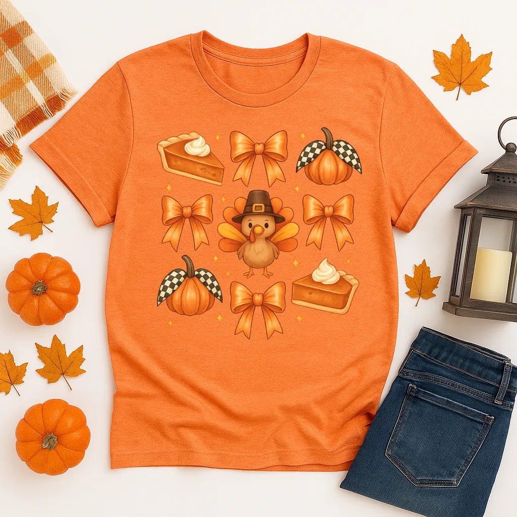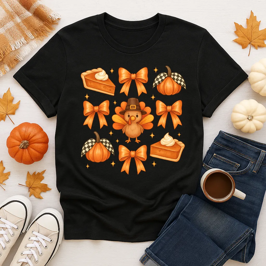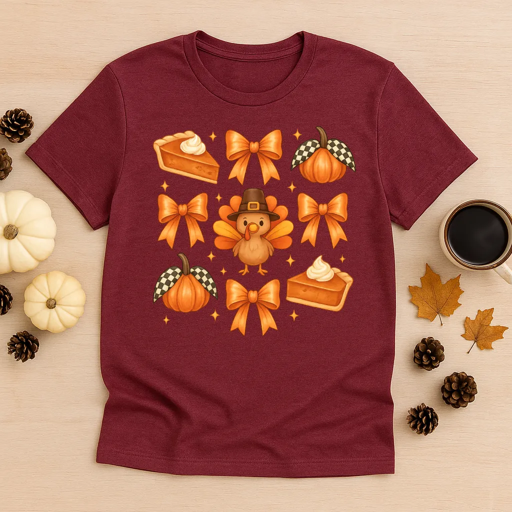 Thanksgiving Turkey Shirt – Cute Pumpkin Pie & Bow Graphic TeeThanksgiving Turkey Shirt – Cute Pumpkin Pie & Bow Graphic Tee